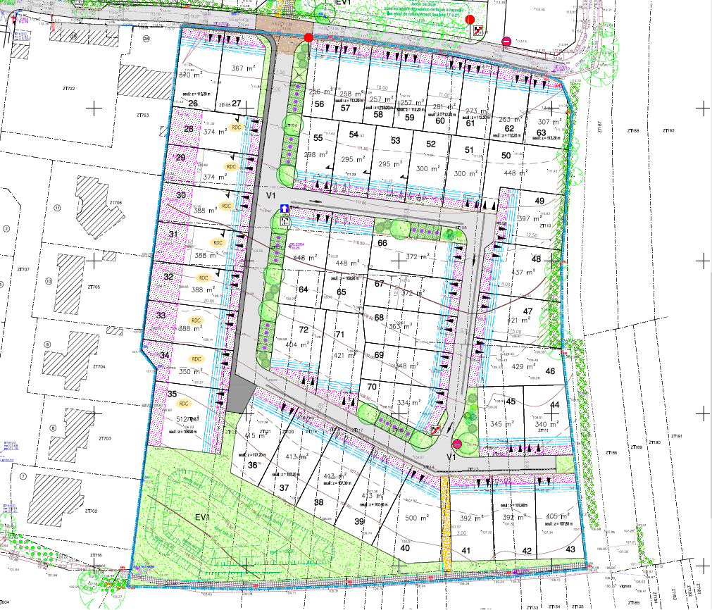 Chaque lot dispose de l'ensemble des branchements : eaux usées, eaux pluviales, eau potable, électricité, télécom, fibre.
